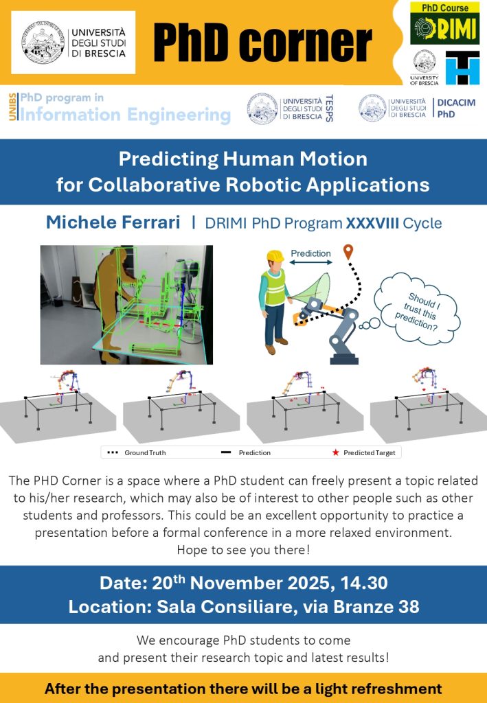 The speaker will be Michele Ferrari (PhD program in DRIMI, XXXVIII Cycle), and will deliver a presentation entitled Predicting Human Motion for Collaborative Robotic Applications”.